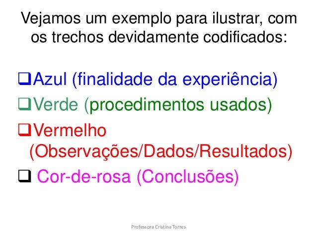 5. 5. Vejamos um exemplo para ilustrar, com os trechos devidamente codificados: Azul (finalidade da experiência) Verde (procedimentos usados) Vermelho (Observações/Dados/Resultados)  Cor-de-rosa (Conclusões) Professora Cristina Torres