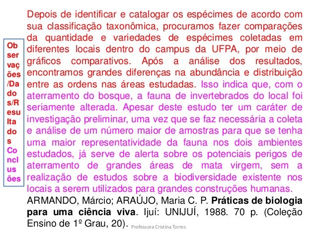 7. 7. Ob ser vaç ões /Da do s/R esu lta do s Co ncl us ões Depois de identificar e catalogar os espécimes de acordo com sua classificação taxonômica, procuramos fazer comparações da quantidade e variedades de espécimes coletadas em diferentes locais dentro do campus da UFPA, por meio de gráficos comparativos. Após a análise dos resultados, encontramos grandes diferenças na abundância e distribuição entre as ordens nas áreas estudadas. Isso indica que, com o aterramento do bosque, a fauna de invertebrados do local foi seriamente alterada. Apesar deste estudo ter um caráter de investigação preliminar, uma vez que se faz necessária a coleta e análise de um número maior de amostras para que se tenha uma maior representatividade da fauna nos dois ambientes estudados, já serve de alerta sobre os potenciais perigos de aterramento de grandes áreas de mata virgem, sem a realização de estudos sobre a biodiversidade existente nos locais a serem utilizados para grandes construções humanas. ARMANDO, Márcio; ARAÚJO, Maria C. P. Práticas de biologia para uma ciência viva. Ijuí: UNIJUÍ, 1988. 70 p. (Coleção Ensino de 1º Grau, 20). Professora Cristina Torres