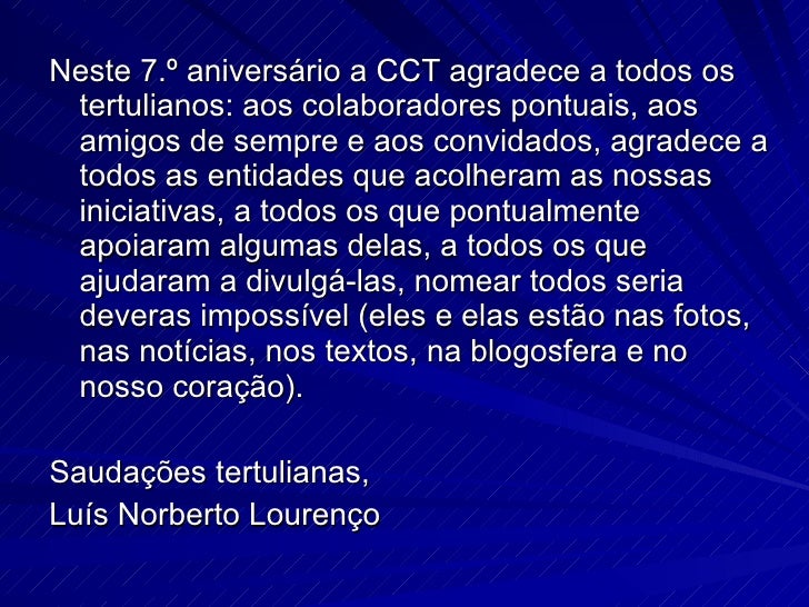 2. 2. <ul><li>Neste 7.º aniversário a CCT agradece a todos os tertulianos: aos colaboradores pontuais, aos amigos de sempre e aos convidados, agradece a todos as entidades que acolheram as nossas iniciativas, a todos os que pontualmente apoiaram algumas delas, a todos os que ajudaram a divulgá-las, nomear todos seria deveras impossível (eles e elas estão nas fotos, nas notícias, nos textos, na blogosfera e no nosso coração). </li></ul><ul><li>Saudações tertulianas, </li></ul><ul><li>Luís Norberto Lourenço </li></ul>