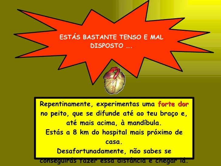 2. 2. ESTÁS BASTANTE TENSO E MAL DISPOSTO …. Repentinamente, experimentas uma forte dor no peito, que se difunde até ao teu braço e, até mais acima, à mandíbula. Estás a 8 km do hospital mais próximo de casa. Desafortunadamente, não sabes se conseguirás fazer essa distância e chegar lá.