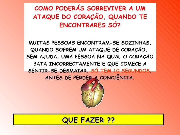 4. 4. COMO PODERÁS SOBREVIVER A UM ATAQUE DO CORAÇÃO, QUANDO TE ENCONTRARES SÓ? MUITAS PESSOAS ENCONTRAM-SE SOZINHAS, QUANDO SOFREM UM ATAQUE DE CORAÇÃO. SEM AJUDA, UMA PESSOA NA QUAL O CORAÇÃO BATA INCORRECTAMENTE E QUE COMECE A SENTIR-SE DESMAIAR, SÓ TEM 10 SEGUNDOS , ANTES DE PERDER A CONCIÊNCIA. QUE FAZER ??