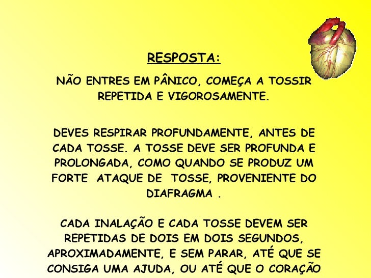5. 5. RESPOSTA: NÃO ENTRES EM PÂNICO, COMEÇA A TOSSIR REPETIDA E VIGOROSAMENTE. DEVES RESPIRAR PROFUNDAMENTE, ANTES DE CADA TOSSE. A TOSSE DEVE SER PROFUNDA E PROLONGADA, COMO QUANDO SE PRODUZ UM FORTE ATAQUE DE TOSSE, PROVENIENTE DO DIAFRAGMA . CADA INALAÇÃO E CADA TOSSE DEVEM SER REPETIDAS DE DOIS EM DOIS SEGUNDOS, APROXIMADAMENTE, E SEM PARAR, ATÉ QUE SE CONSIGA UMA AJUDA, OU ATÉ QUE O CORAÇÃO ESTEJA, DE NOVO, A BATER NORMALMENTE.