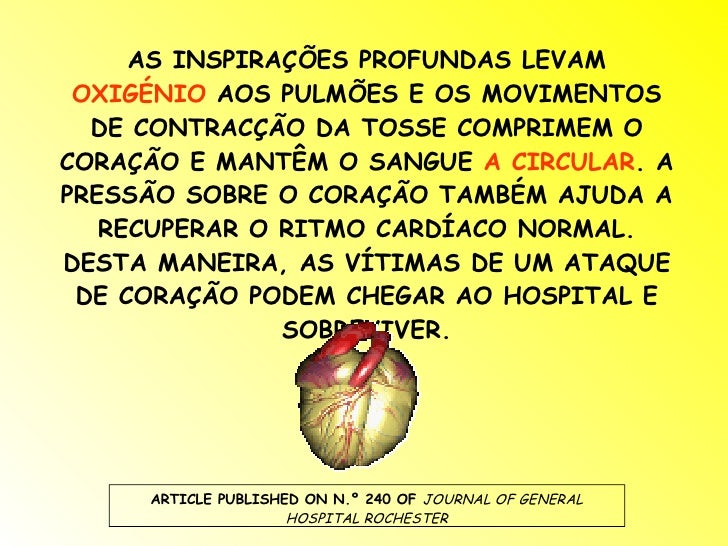 6. 6. AS INSPIRAÇÕES PROFUNDAS LEVAM OXIGÉNIO AOS PULMÕES E OS MOVIMENTOS DE CONTRACÇÃO DA TOSSE COMPRIMEM O CORAÇÃO E MANTÊM O SANGUE A CIRCULAR . A PRESSÃO SOBRE O CORAÇÃO TAMBÉM AJUDA A RECUPERAR O RITMO CARDÍACO NORMAL. DESTA MANEIRA, AS VÍTIMAS DE UM ATAQUE DE CORAÇÃO PODEM CHEGAR AO HOSPITAL E SOBREVIVER. ARTICLE PUBLISHED ON N.º 240 OF JOURNAL OF GENERAL HOSPITAL ROCHESTER