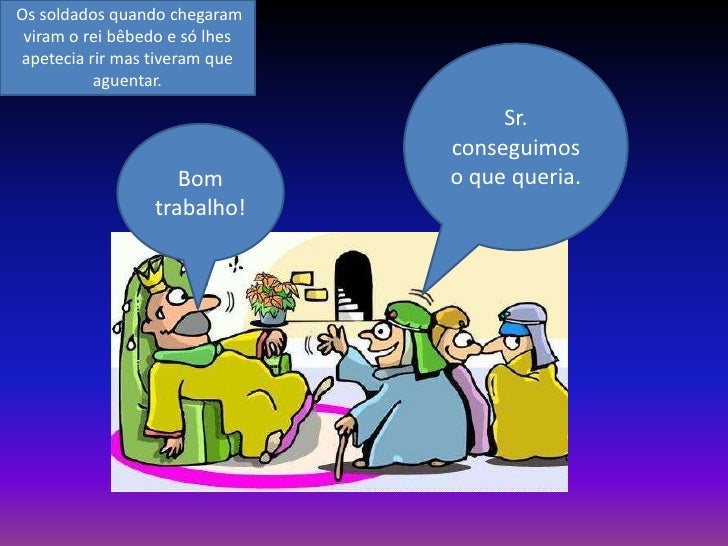 10. 10. Os soldados quando chegaram viram o rei bêbedo e só lhesapetecia rir mas tiveram que aguentar. Sr. conseguimos Bom o que queria. trabalho!