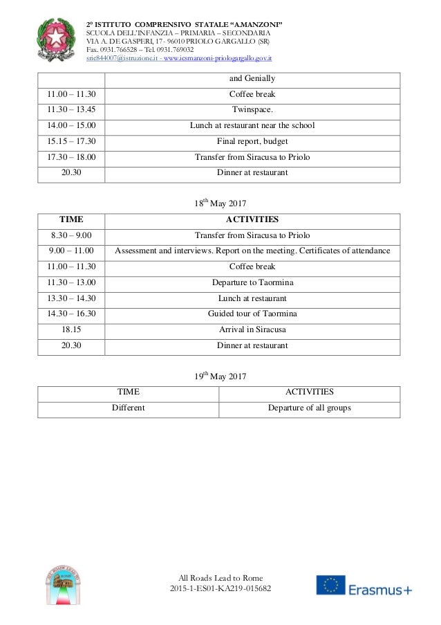 The agenda of our second transnational meeting, which took place in Priolo Gargallo, in Sicily, Italy, from 15th to 19th May 2017.