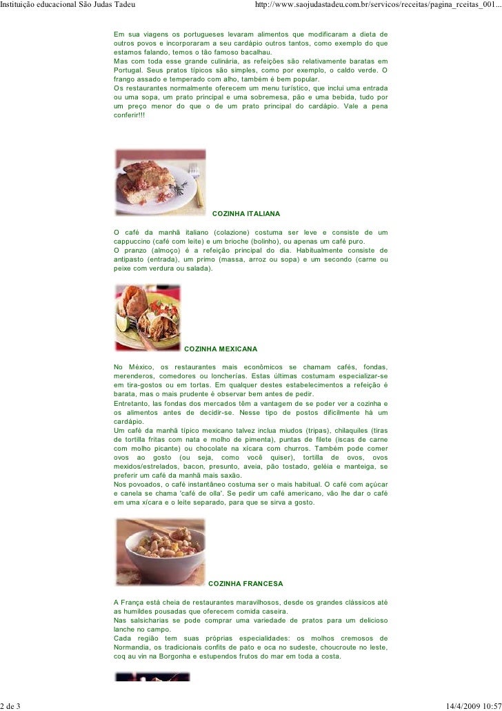 2. 2. Instituição educacional São Judas Tadeu http://www.saojudastadeu.com.br/servicos/receitas/pagina_rceitas_001... Em sua viagens os portugueses levaram alimentos que modificaram a dieta de outros povos e incorporaram a seu cardápio outros tantos, como exemplo do que estamos falando, temos o tão famoso bacalhau. Mas com toda esse grande culinária, as refeições são relativamente baratas em Portugal. Seus pratos típicos são simples, como por exemplo, o caldo verde. O frango assado e temperado com alho, também é bem popular. Os restaurantes normalmente oferecem um menu turístico, que inclui uma entrada ou uma sopa, um prato principal e uma sobremesa, pão e uma bebida, tudo por um preço menor do que o de um prato principal do cardápio. Vale a pena conferir!!! COZINHA ITALIANA O café da manhã italiano (colazione) costuma ser leve e consiste de um cappuccino (café com leite) e um brioche (bolinho), ou apenas um café puro. O pranzo (almoço) é a refeição principal do dia. Habitualmente consiste de antipasto (entrada), um primo (massa, arroz ou sopa) e um secondo (carne ou peixe com verdura ou salada). COZINHA MEXICANA No México, os restaurantes mais econômicos se chamam cafés, fondas, merenderos, comedores ou loncherías. Estas últimas costumam especializar-se em tira-gostos ou em tortas. Em qualquer destes estabelecimentos a refeição é barata, mas o mais prudente é observar bem antes de pedir. Entretanto, las fondas dos mercados têm a vantagem de se poder ver a cozinha e os alimentos antes de decidir-se. Nesse tipo de postos dificilmente há um cardápio. Um café da manhã típico mexicano talvez inclua miudos (tripas), chilaquiles (tiras de tortilla fritas com nata e molho de pimenta), puntas de filete (iscas de carne com molho picante) ou chocolate na xícara com churros. Também pode comer ovos ao gosto (ou seja, como você quiser), tortilla de ovos, ovos mexidos/estrelados, bacon, presunto, aveia, pão tostado, geléia e manteiga, se preferir um café da manhã mais saxão. Nos povoados, o café instantâneo costuma ser o mais habitual. O café com açúcar e canela se chama 'café de olla'. Se pedir um café americano, vão lhe dar o café em uma xícara e o leite separado, para que se sirva a gosto. COZINHA FRANCESA A França está cheia de restaurantes maravilhosos, desde os grandes clássicos até as humildes pousadas que oferecem comida caseira. Nas salsicharias se pode comprar uma variedade de pratos para um delicioso lanche no campo. Cada região tem suas próprias especialidades: os molhos cremosos de Normandia, os tradicionais confits de pato e oca no sudeste, choucroute no leste, coq au vin na Borgonha e estupendos frutos do mar em toda a costa. 2 de 3 14/4/2009 10:57