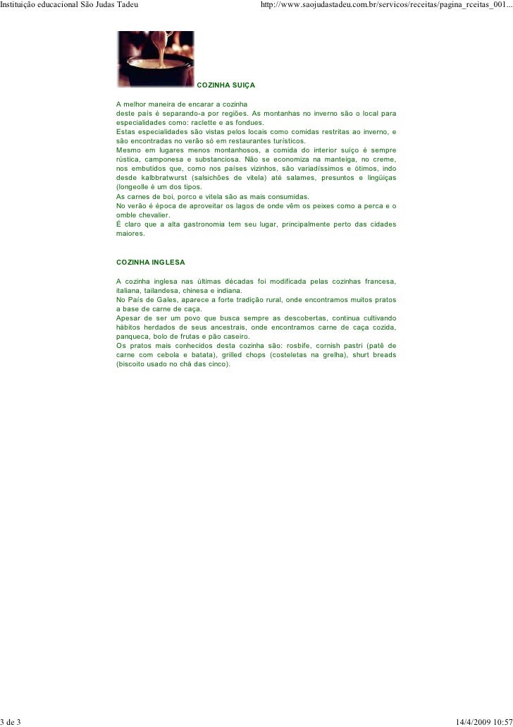3. 3. Instituição educacional São Judas Tadeu http://www.saojudastadeu.com.br/servicos/receitas/pagina_rceitas_001... COZINHA SUIÇA A melhor maneira de encarar a cozinha deste país é separando-a por regiões. As montanhas no inverno são o local para especialidades como: raclette e as fondues. Estas especialidades são vistas pelos locais como comidas restritas ao inverno, e são encontradas no verão só em restaurantes turísticos. Mesmo em lugares menos montanhosos, a comida do interior suíço é sempre rústica, camponesa e substanciosa. Não se economiza na manteiga, no creme, nos embutidos que, como nos países vizinhos, são variadíssimos e ótimos, indo desde kalbbratwurst (salsichões de vitela) até salames, presuntos e lingüiças (longeolle é um dos tipos. As carnes de boi, porco e vitela são as mais consumidas. No verão é época de aproveitar os lagos de onde vêm os peixes como a perca e o omble chevalier. É claro que a alta gastronomia tem seu lugar, principalmente perto das cidades maiores. COZINHA INGLESA A cozinha inglesa nas últimas décadas foi modificada pelas cozinhas francesa, italiana, tailandesa, chinesa e indiana. No País de Gales, aparece a forte tradição rural, onde encontramos muitos pratos a base de carne de caça. Apesar de ser um povo que busca sempre as descobertas, continua cultivando hábitos herdados de seus ancestrais, onde encontramos carne de caça cozida, panqueca, bolo de frutas e pão caseiro. Os pratos mais conhecidos desta cozinha são: rosbife, cornish pastri (patê de carne com cebola e batata), grilled chops (costeletas na grelha), shurt breads (biscoito usado no chá das cinco). 3 de 3 14/4/2009 10:57