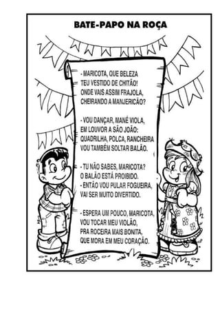 1) Um diálogo entre Maricota e Zé Vicente onde Maricota provoca Zé Vicente sobre seu cabelo e pé grande e Zé Vicente se defende dizendo que seu pé é grande por ser um bom caçador. 2) Zé Vicente convida Maricota para dançar apesar de seu pé grande, garantindo que ainda serve para dançar. 3) No final eles se despedem como bons amigos, sem precisar duvidar um do outro.