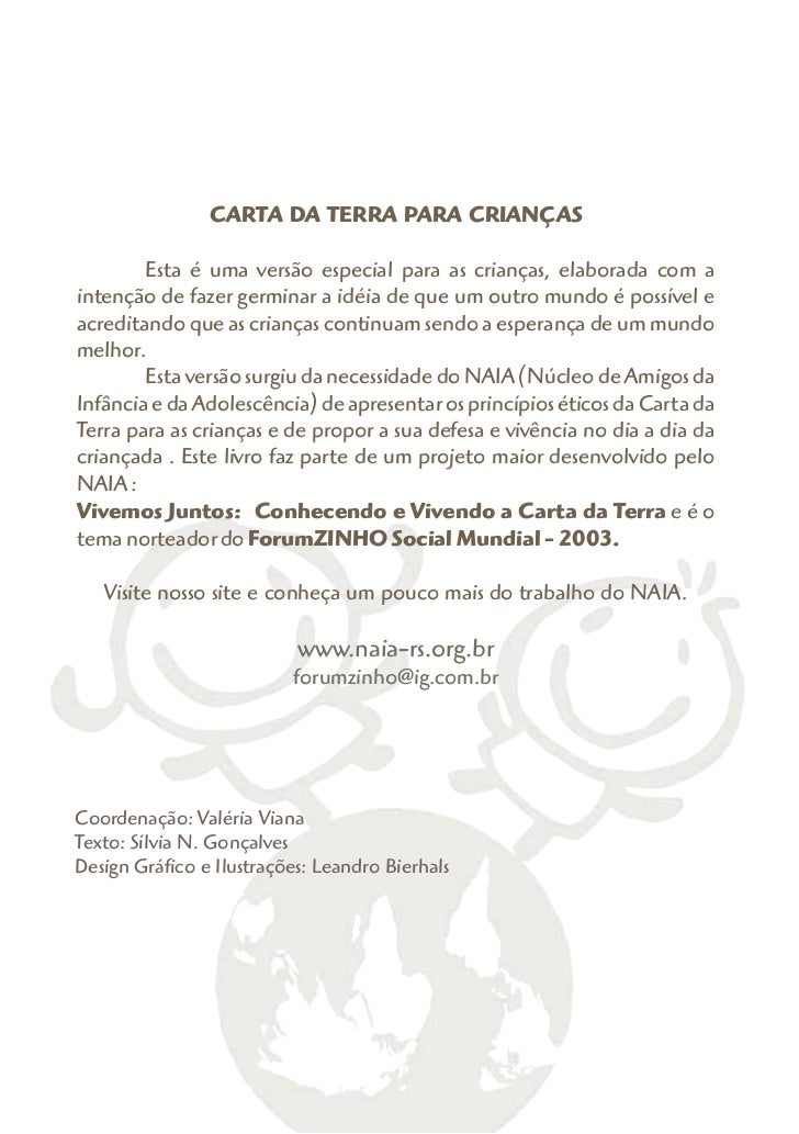 Na continuação desse projeto, está prevista a tradução da Carta para outros idiomas, como o espanhol, o catalão e inglês. Além da Carta da Terra para Jovens e um projeto de escrita de uma Carta da Terra pelos protagonistas do Projeto Vivemos juntos, isto é, as crianças e jovens beneficiados pelo projeto." (Carta da Terra para Crianças encontrada aqui: http://www.cartadaterra.org/ctcriancas.htm)