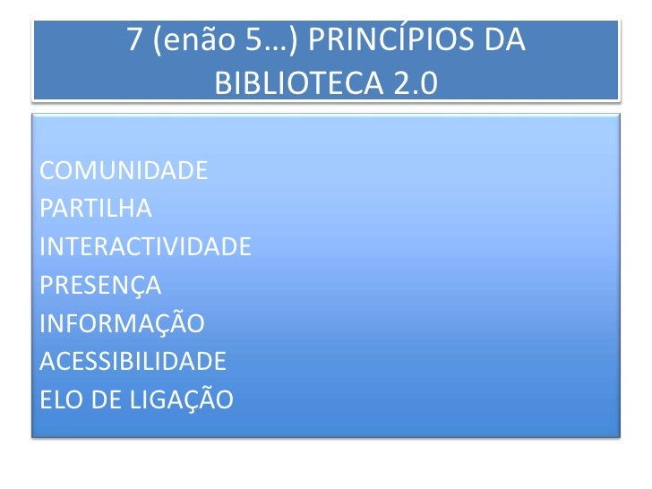 2. 2. 7 (enão 5…) PRINCÍPIOS DA BIBLIOTECA 2.0<br />COMUNIDADE<br />PARTILHA <br />INTERACTIVIDADE<br />PRESENÇA<br />INFORMAÇÃO <br />ACESSIBILIDADE<br />ELO DE LIGAÇÃO<br />