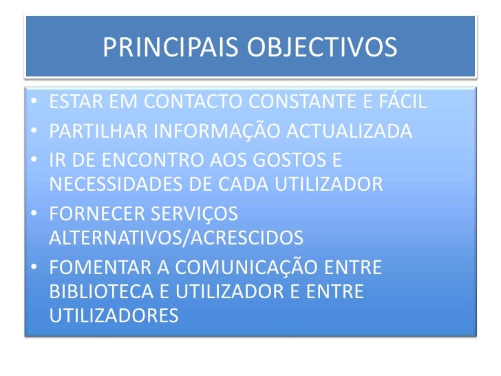 3. 3. PRINCIPAIS OBJECTIVOS<br />ESTAR EM CONTACTO CONSTANTE E FÁCIL<br />PARTILHAR INFORMAÇÃO ACTUALIZADA<br />IR DE ENCONTRO AOS GOSTOS E NECESSIDADES DE CADA UTILIZADOR<br />FORNECER SERVIÇOS ALTERNATIVOS/ACRESCIDOS<br />FOMENTAR A COMUNICAÇÃO ENTRE BIBLIOTECA E UTILIZADOR E ENTRE UTILIZADORES<br />