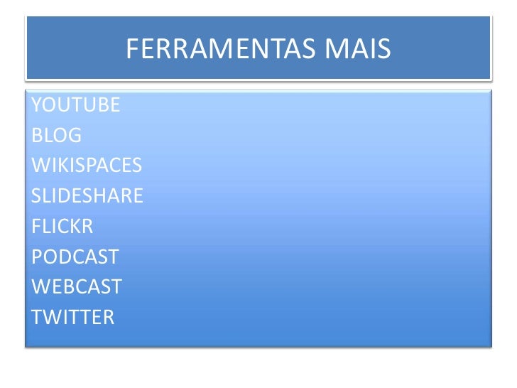 4. 4. FERRAMENTAS MAIS<br />YOUTUBE<br />BLOG<br />WIKISPACES<br />SLIDESHARE<br />FLICKR<br />PODCAST<br />WEBCAST<br />TWITTER <br />
