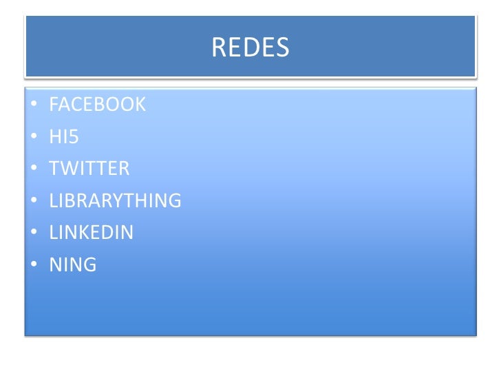 5. 5. REDES<br />FACEBOOK<br />HI5<br />TWITTER <br />LIBRARYTHING<br />LINKEDIN<br />NING<br />