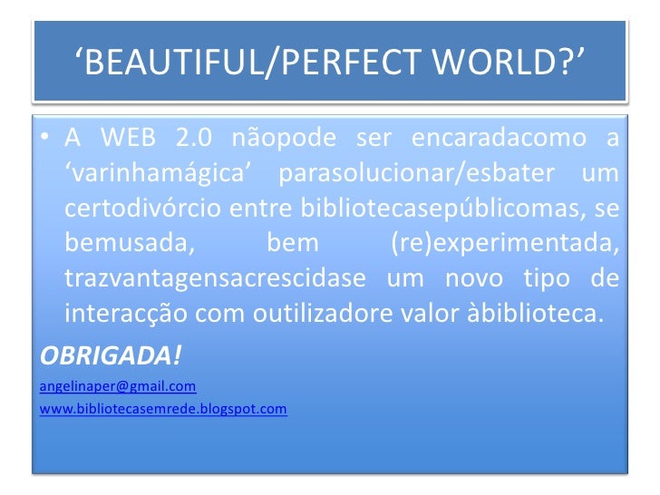6. 6. ‘BEAUTIFUL/PERFECT WORLD?’<br />A WEB 2.0 nãopode ser encaradacomo a ‘varinhamágica’ parasolucionar/esbater um certodivórcio entre bibliotecasepúblicomas, se bemusada, bem (re)experimentada, trazvantagensacrescidase um novo tipo de interacção com outilizadore valor àbiblioteca.<br />OBRIGADA!<br />angelinaper@gmail.com<br />www.bibliotecasemrede.blogspot.com<br />