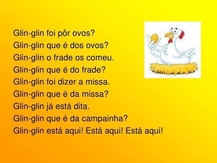 10. 10. Glin-glin foi pôr ovos?<br />Glin-glin que é dos ovos?<br />Glin-glin o frade os comeu.<br />Glin-glin que é do frade?<br />Glin-glin foi dizer a missa.<br />Glin-glin que é da missa?<br />Glin-glin já está dita.<br />Glin-glin que é da campainha?<br />Glin-glin está aqui! Está aqui! Está aqui!<br />