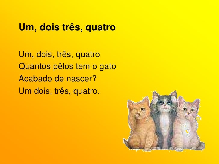 12. 12. Um, dois três, quatro<br />Um, dois, três, quatro<br />Quantos pêlos tem o gato<br />Acabado de nascer?<br />Um dois, três, quatro.<br />