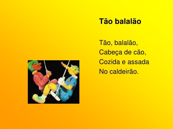 13. 13. Tão balalão<br />Tão, balalão,<br />Cabeça de cão,<br />Cozida e assada<br />No caldeirão.<br />