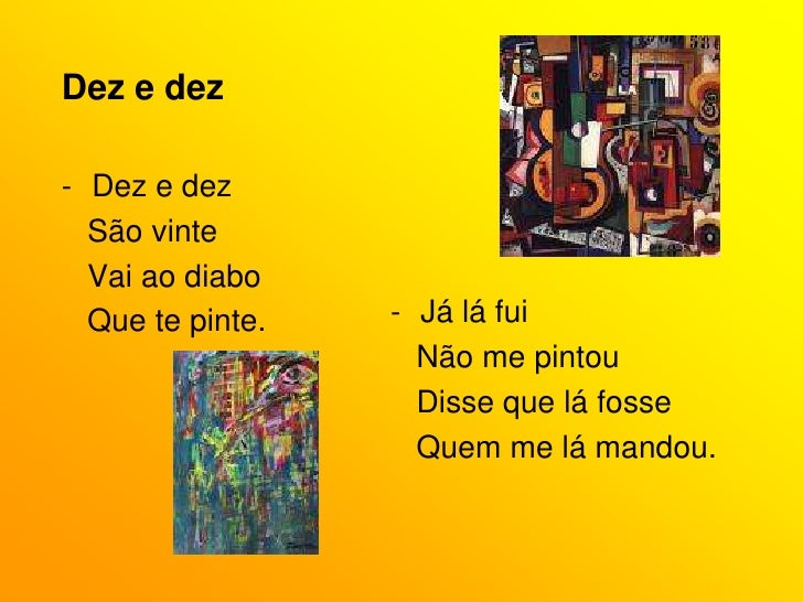 14. 14. Dez e dez<br /><ul><li>Dez e dez</li></ul> São vinte<br /> Vai ao diabo<br /> Que te pinte.<br /><ul><li>Já lá fui</li></ul> Não me pintou<br /> Disse que lá fosse<br /> Quem me lá mandou.<br />