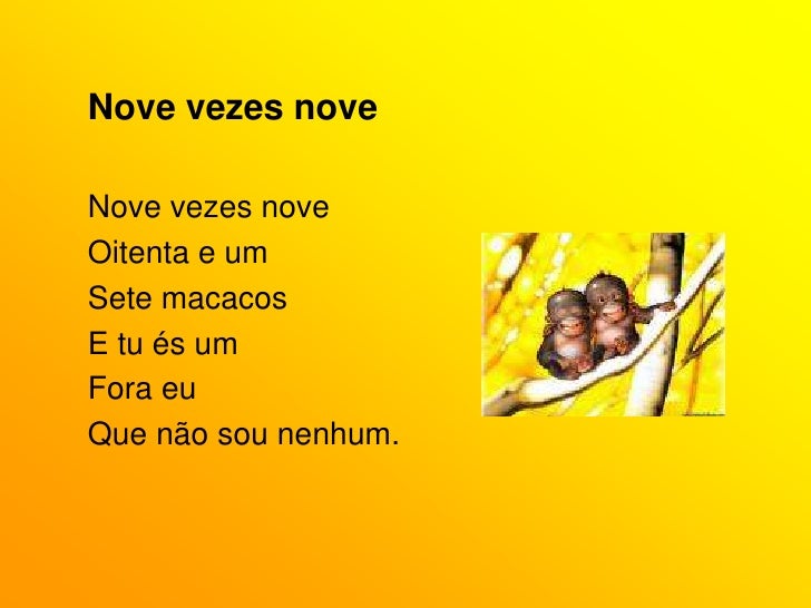 15. 15. Nove vezes nove<br />Nove vezes nove<br />Oitenta e um<br />Sete macacos<br />E tu és um<br />Fora eu<br />Que não sou nenhum.<br />