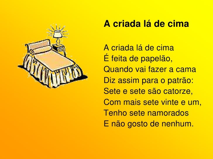 16. 16. A criada lá de cima<br />A criada lá de cima<br />É feita de papelão,<br />Quando vai fazer a cama<br />Diz assim para o patrão:<br />Sete e sete são catorze,<br />Com mais sete vinte e um,<br />Tenho sete namorados<br />E não gosto de nenhum.<br />
