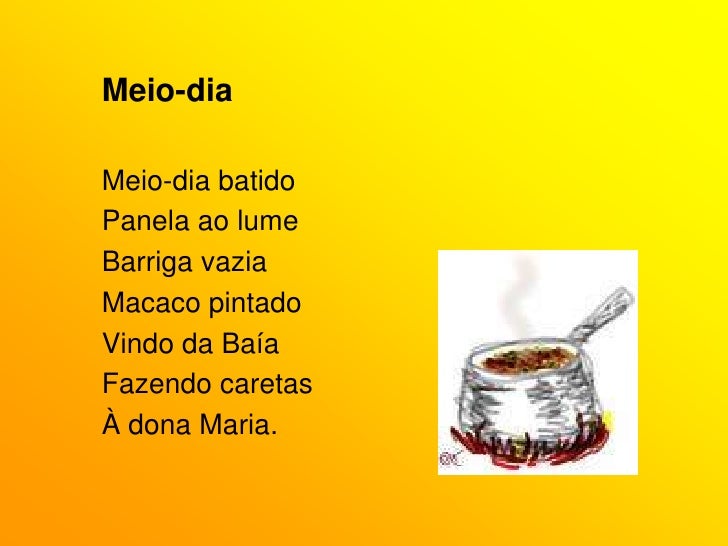 18. 18. Meio-dia<br />Meio-dia batido<br />Panela ao lume<br />Barriga vazia<br />Macaco pintado<br />Vindo da Baía<br />Fazendo caretas<br />À dona Maria.<br />