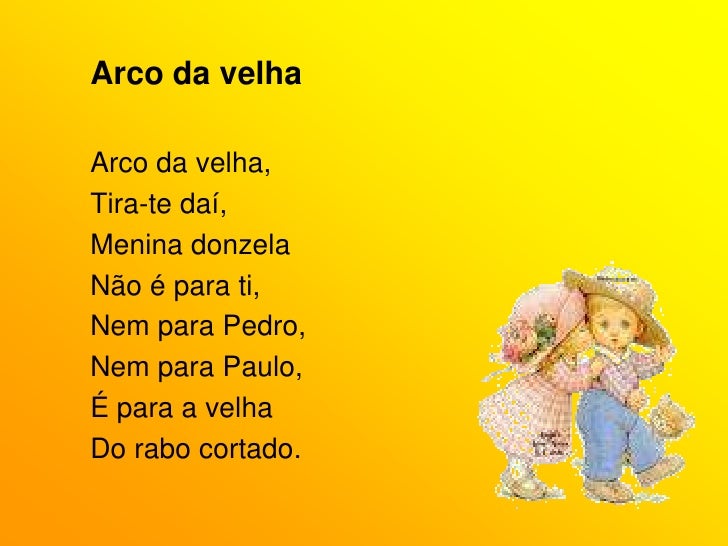 21. 21. Arco da velha<br />Arco da velha,<br />Tira-te daí,<br />Menina donzela<br />Não é para ti,<br />Nem para Pedro,<br />Nem para Paulo,<br />É para a velha<br />Do rabo cortado.<br />