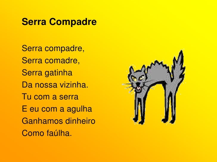 22. 22. Serra Compadre<br />Serra compadre,<br />Serra comadre,<br />Serra gatinha<br />Da nossa vizinha.<br />Tu com a serra<br />E eu com a agulha<br />Ganhamos dinheiro<br />Como faúlha.<br />