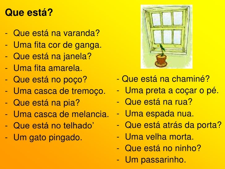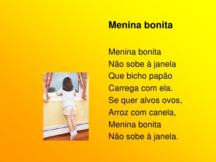 28. 28. Morrões de candeia.</li></li></ul><li>Menina bonita<br />Menina bonita<br />Não sobe à janela<br />Que bicho papão<br />Carrega com ela.<br />Se quer alvos ovos,<br />Arroz com canela,<br />Menina bonita<br />Não sobe à janela.<br />