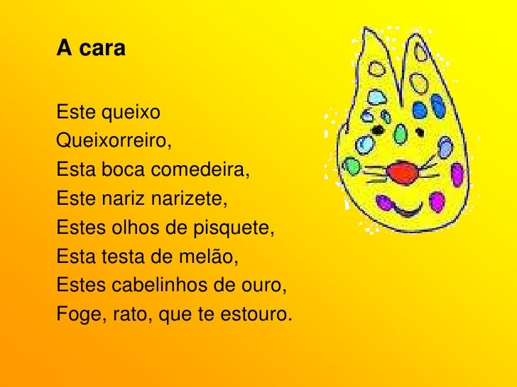 29. 29. A cara<br />Este queixo<br />Queixorreiro,<br />Esta boca comedeira,<br />Este nariz narizete,<br />Estes olhos de pisquete,<br />Esta testa de melão,<br />Estes cabelinhos de ouro,<br />Foge, rato, que te estouro.<br />