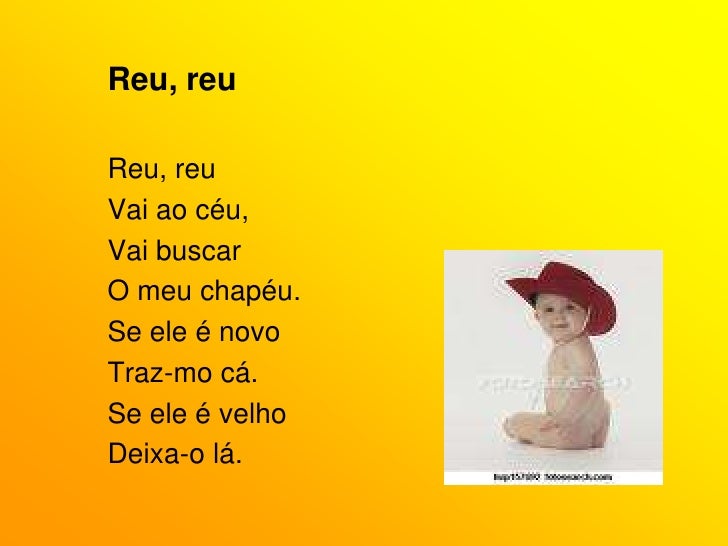 30. 30. Reu, reu<br />Reu, reu<br />Vai ao céu,<br />Vai buscar<br />O meu chapéu.<br />Se ele é novo<br />Traz-mo cá.<br />Se ele é velho<br />Deixa-o lá. <br />