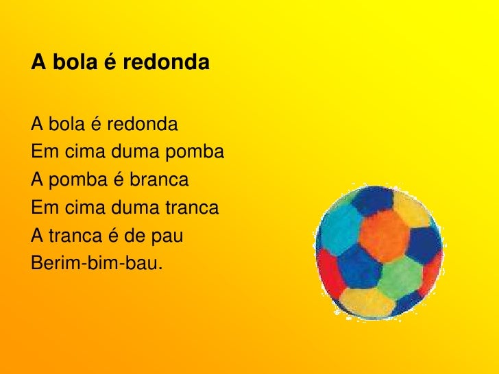 48. 48. A bola é redonda<br />A bola é redonda<br />Em cima duma pomba<br />A pomba é branca<br />Em cima duma tranca<br />A tranca é de pau<br />Berim-bim-bau.<br />