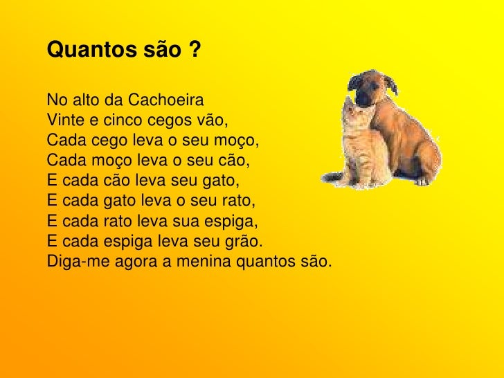 3. 3. Quantos são ?<br />No alto da Cachoeira<br />Vinte e cinco cegos vão,<br />Cada cego leva o seu moço,<br />Cada moço leva o seu cão,<br />E cada cão leva seu gato,<br />E cada gato leva o seu rato,<br />E cada rato leva sua espiga,<br />E cada espiga leva seu grão.<br />Diga-me agora a menina quantos são.<br />