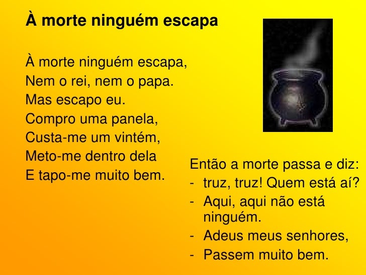49. 49. À morte ninguém escapa<br />À morte ninguém escapa,<br />Nem o rei, nem o papa.<br />Mas escapo eu.<br />Compro uma panela,<br />Custa-me um vintém,<br />Meto-me dentro dela<br />E tapo-me muito bem.<br />Então a morte passa e diz:<br /><ul><li>truz, truz! Quem está aí?