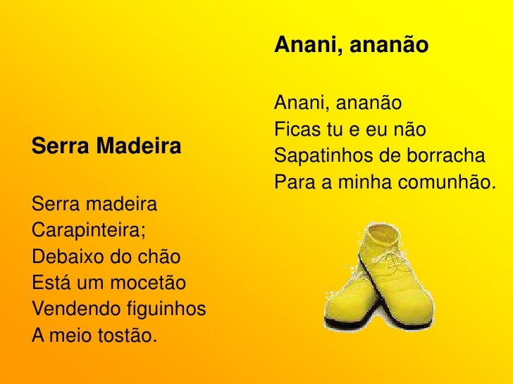 52. 52. Passem muito bem.</li></li></ul><li>Anani, ananão<br />Anani, ananão<br />Ficas tu e eu não<br />Sapatinhos de borracha<br />Para a minha comunhão.<br />Serra Madeira<br />Serra madeira<br />Carapinteira;<br />Debaixo do chão<br />Está um mocetão<br />Vendendo figuinhos<br />A meio tostão.<br />
