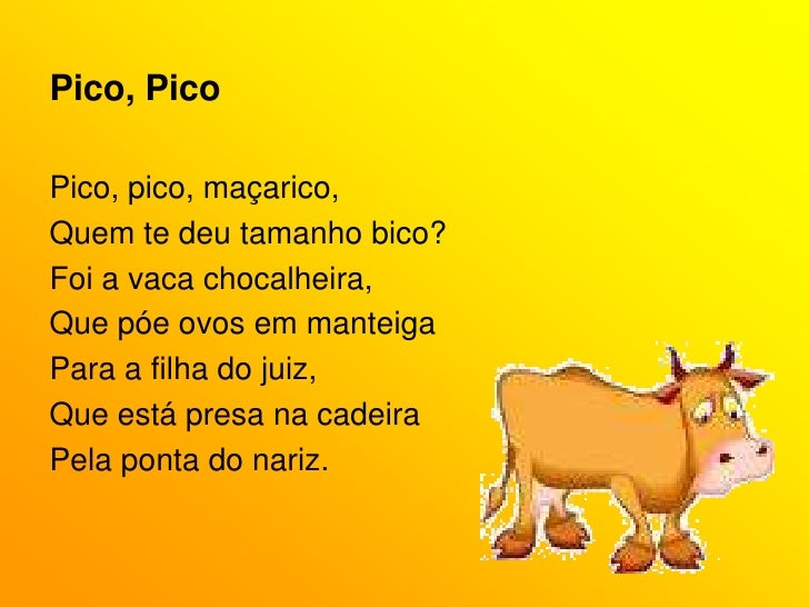 53. 53. Pico, Pico<br />Pico, pico, maçarico,<br />Quem te deu tamanho bico?<br />Foi a vaca chocalheira,<br />Que póe ovos em manteiga<br />Para a filha do juiz,<br />Que está presa na cadeira<br />Pela ponta do nariz.<br />