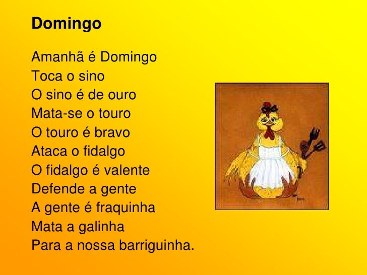 54. 54. Domingo<br />Amanhã é Domingo<br />Toca o sino<br />O sino é de ouro<br />Mata-se o touro<br />O touro é bravo<br />Ataca o fidalgo<br />O fidalgo é valente<br />Defende a gente<br />A gente é fraquinha<br />Mata a galinha<br />Para a nossa barriguinha.<br />