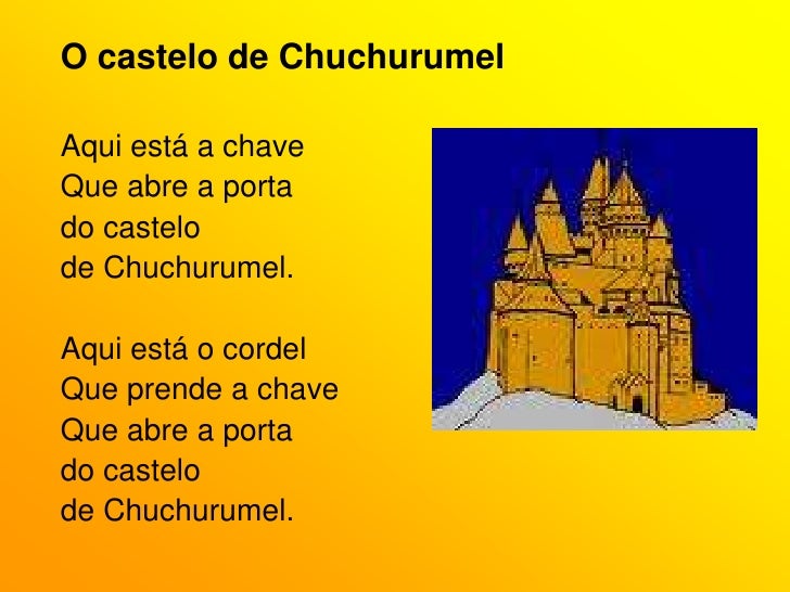 55. 55. O castelo de Chuchurumel<br />Aqui está a chave<br />Que abre a porta<br />do castelo <br />de Chuchurumel.<br />Aqui está o cordel<br />Que prende a chave<br />Que abre a porta<br />do castelo <br />de Chuchurumel.<br />