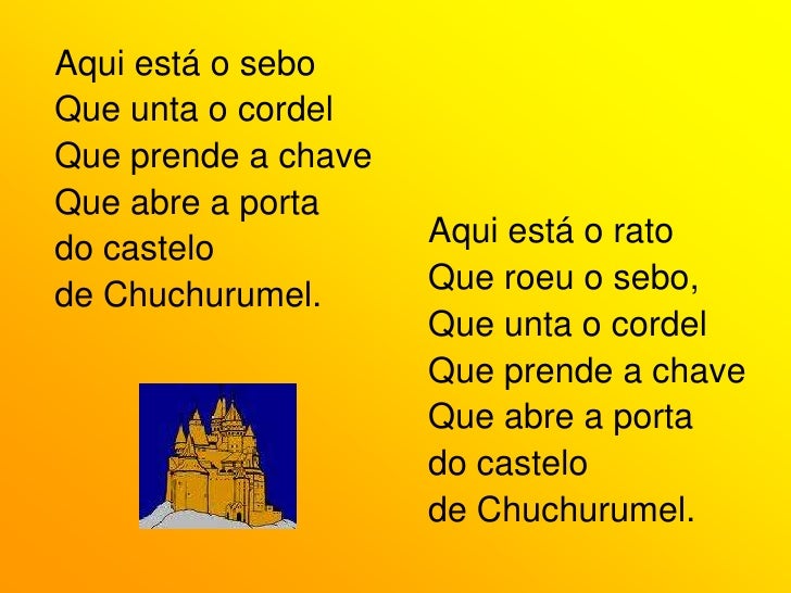 56. 56. Aqui está o sebo<br />Que unta o cordel<br />Que prende a chave<br />Que abre a porta<br />do castelo <br />de Chuchurumel.<br />Aqui está o rato<br />Que roeu o sebo,<br />Que unta o cordel<br />Que prende a chave<br />Que abre a porta<br />do castelo <br />de Chuchurumel.<br />