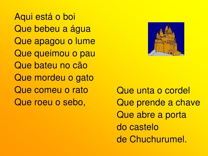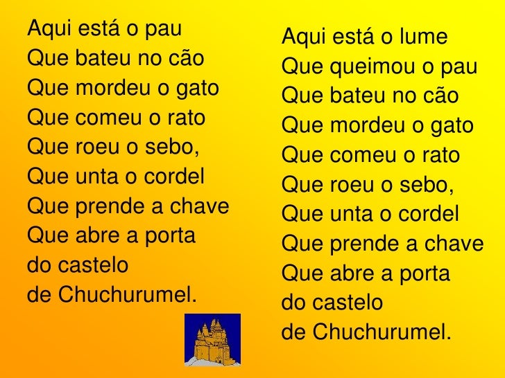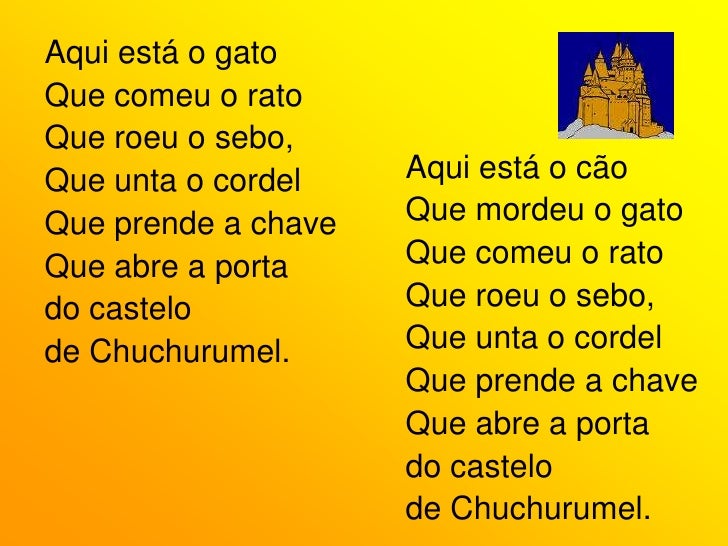 57. 57. Aqui está o gato<br />Que comeu o rato<br />Que roeu o sebo,<br />Que unta o cordel<br />Que prende a chave<br />Que abre a porta<br />do castelo <br />de Chuchurumel.<br />Aqui está o cão<br />Que mordeu o gato<br />Que comeu o rato<br />Que roeu o sebo,<br />Que unta o cordel<br />Que prende a chave<br />Que abre a porta<br />do castelo <br />de Chuchurumel.<br />