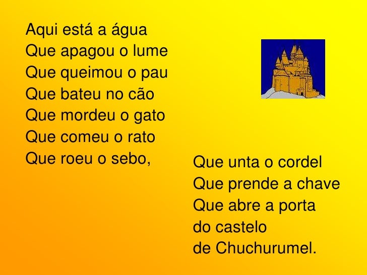 58. 58. Aqui está o pau<br />Que bateu no cão<br />Que mordeu o gato<br />Que comeu o rato<br />Que roeu o sebo,<br />Que unta o cordel<br />Que prende a chave<br />Que abre a porta<br />do castelo <br />de Chuchurumel.<br />Aqui está o lume<br />Que queimou o pau<br />Que bateu no cão<br />Que mordeu o gato<br />Que comeu o rato<br />Que roeu o sebo,<br />Que unta o cordel<br />Que prende a chave<br />Que abre a porta<br />do castelo <br />de Chuchurumel.<br />