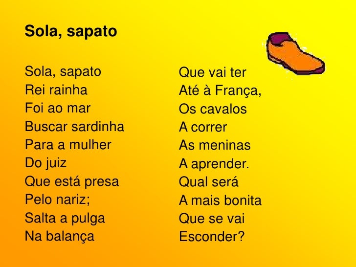 4. 4. Sola, sapato<br />Sola, sapato<br />Rei rainha<br />Foi ao mar<br />Buscar sardinha<br />Para a mulher<br />Do juiz<br />Que está presa<br />Pelo nariz;<br />Salta a pulga<br />Na balança<br />Que vai ter<br />Até à França,<br />Os cavalos<br />A correr<br />As meninas<br />A aprender.<br />Qual será<br />A mais bonita<br />Que se vai<br />Esconder?<br />