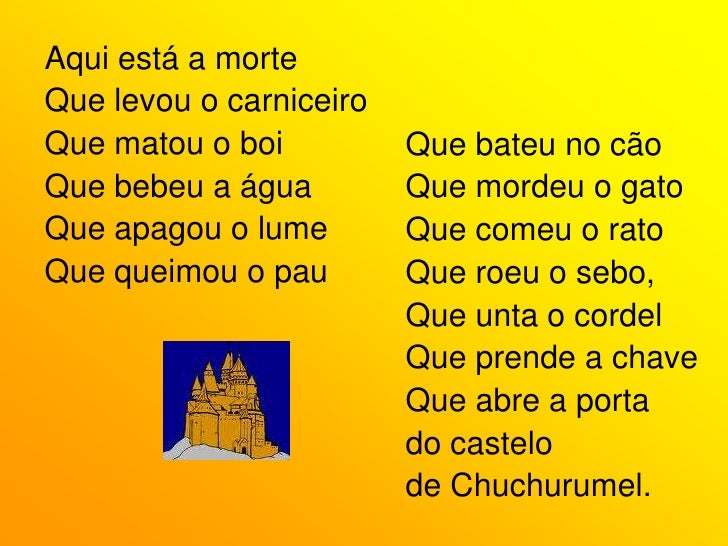 62. 62. Aqui está a morte<br />Que levou o carniceiro<br />Que matou o boi<br />Que bebeu a água<br />Que apagou o lume<br />Que queimou o pau<br />Que bateu no cão<br />Que mordeu o gato<br />Que comeu o rato<br />Que roeu o sebo,<br />Que unta o cordel<br />Que prende a chave<br />Que abre a porta<br />do castelo <br />de Chuchurumel.<br />