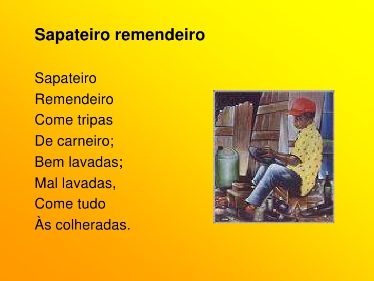 63. 63. Sapateiro remendeiro<br />Sapateiro<br />Remendeiro<br />Come tripas<br />De carneiro;<br />Bem lavadas;<br />Mal lavadas,<br />Come tudo<br />Às colheradas.<br />
