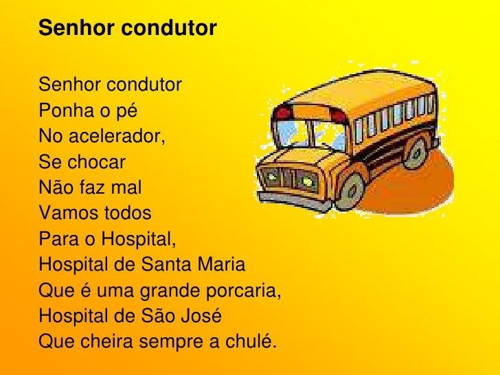 64. 64. Senhor condutor<br />Senhor condutor<br />Ponha o pé<br />No acelerador,<br />Se chocar<br />Não faz mal<br />Vamos todos<br />Para o Hospital,<br />Hospital de Santa Maria<br />Que é uma grande porcaria,<br />Hospital de São José<br />Que cheira sempre a chulé.<br />