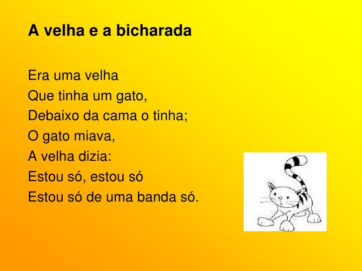 65. 65. A velha e a bicharada<br />Era uma velha<br />Que tinha um gato,<br />Debaixo da cama o tinha;<br />O gato miava,<br />A velha dizia:<br />Estou só, estou só<br />Estou só de uma banda só.<br />