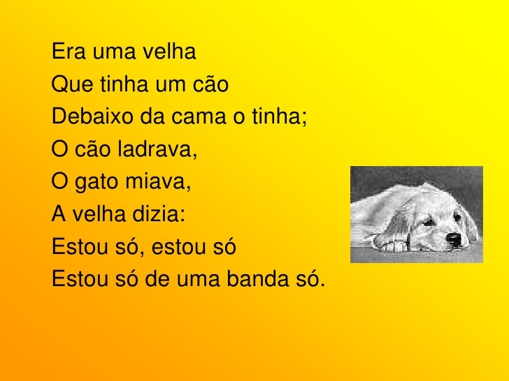 66. 66. Era uma velha<br />Que tinha um cão<br />Debaixo da cama o tinha;<br />O cão ladrava,<br />O gato miava,<br />A velha dizia:<br />Estou só, estou só<br />Estou só de uma banda só.<br />