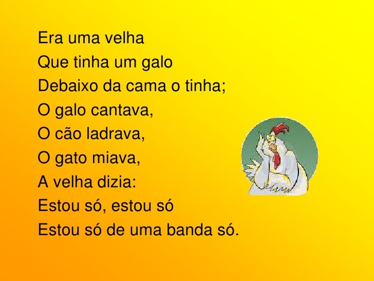 67. 67. Era uma velha<br />Que tinha um galo<br />Debaixo da cama o tinha;<br />O galo cantava,<br />O cão ladrava,<br />O gato miava,<br />A velha dizia:<br />Estou só, estou só<br />Estou só de uma banda só.<br />