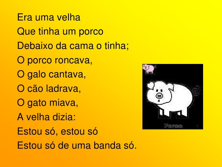 68. 68. Era uma velha<br />Que tinha um porco<br />Debaixo da cama o tinha;<br />O porco roncava,<br />O galo cantava,<br />O cão ladrava,<br />O gato miava,<br />A velha dizia:<br />Estou só, estou só<br />Estou só de uma banda só.<br />