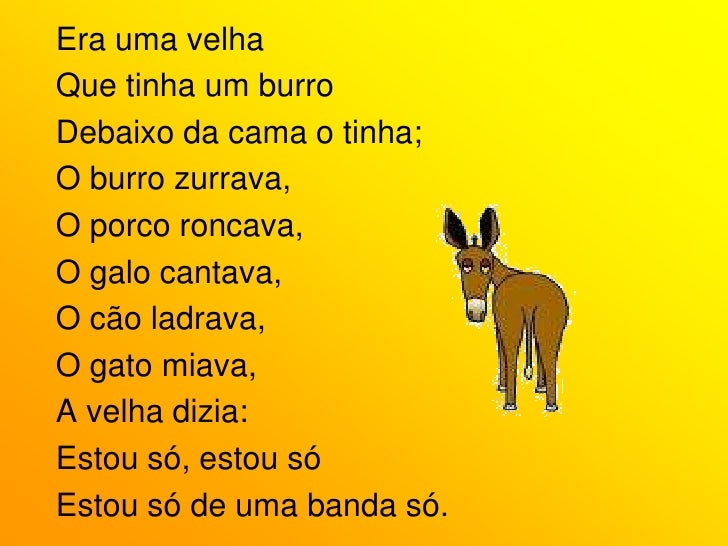 69. 69. Era uma velha<br />Que tinha um burro<br />Debaixo da cama o tinha;<br />O burro zurrava,<br />O porco roncava,<br />O galo cantava,<br />O cão ladrava,<br />O gato miava,<br />A velha dizia:<br />Estou só, estou só<br />Estou só de uma banda só.<br />