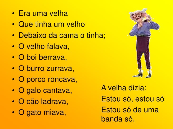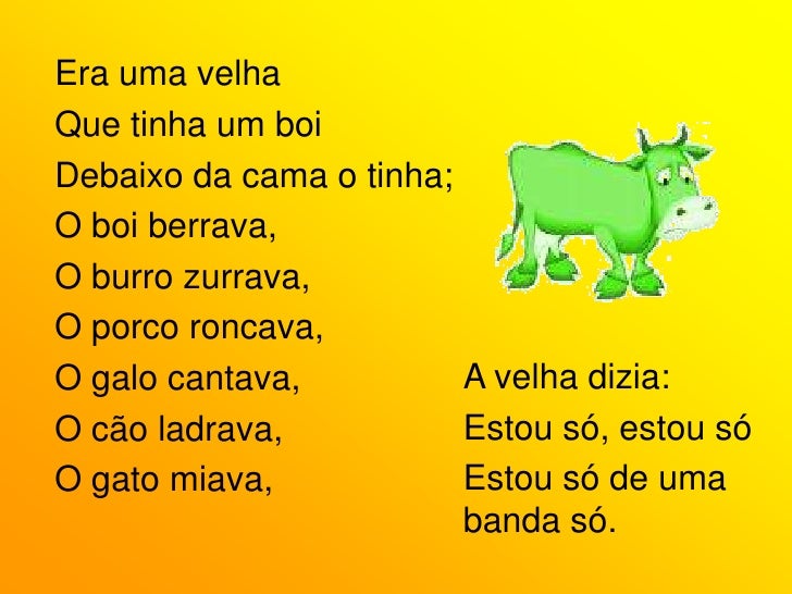 70. 70. Era uma velha<br />Que tinha um boi<br />Debaixo da cama o tinha;<br />O boi berrava,<br />O burro zurrava,<br />O porco roncava,<br />O galo cantava,<br />O cão ladrava,<br />O gato miava,<br />A velha dizia:<br />Estou só, estou só<br />Estou só de uma banda só.<br />